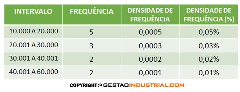 Agora, queremos mudar o último intervalo para R$40.001 a R$60.000. Devemos, então, calcular a densidade de frequência, conforme a tabela: