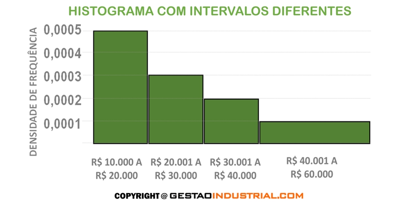 Tudo que vimos até agora, foi relativo a histogramas com intervalos iguais. Mas, e quando não são iguais? Se, no caso de intervalos iguais, a altura da coluna é igual à frequência da variável naquele intervalo, quando os intervalos não são iguais, a altura da coluna será igual à densidade de frequência.