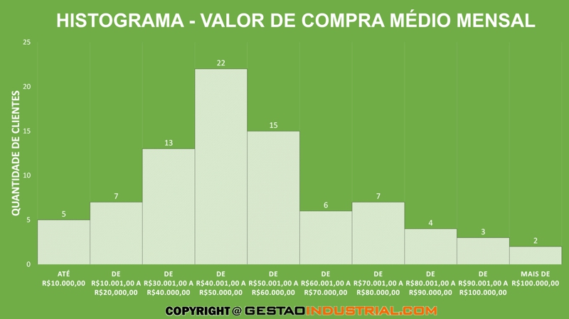 Com base nesse histograma, pode-se traçar estratégias para aumentar o faturamento dos 25 clientes (5 + 7 + 13) que têm feito compras com faturamento médio mais baixo.