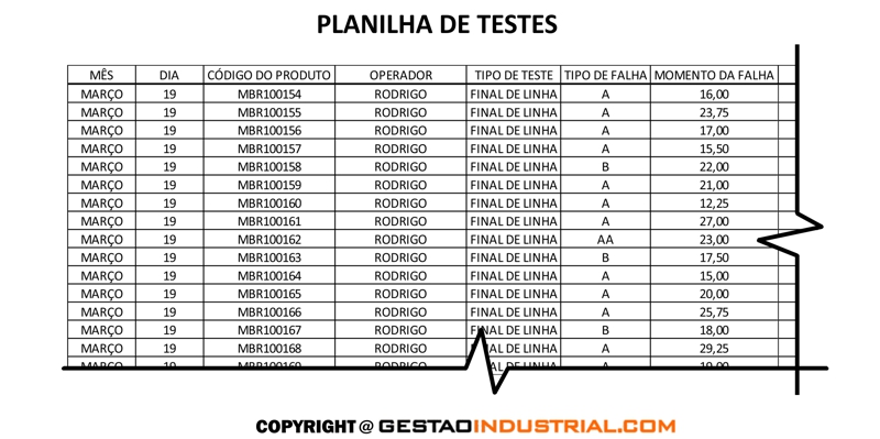Vamos ver um exemplo com dados coletados de testes feitos com um motor ao final de uma linha de montagem. O teste é feito em 100% dos produtos, e a planilha de dados mostra o momento em que cada falha ocorre. Veja, a seguir, uma amostra da planilha de dados dos testes: