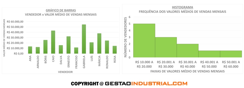 No gráfico de barras vemos a relação de cada vendedor com o valor médio de vendas mensais, e dá pra ver que a Ana está vendendo pouco mais de 10 mil por mês; mas, no histograma, vemos a frequência que determinado valor médio de vendas mensais ocorre, e dá pra ver que há 5 vendedores vendendo um valor médio de 10 mil a 20 mil no mês.