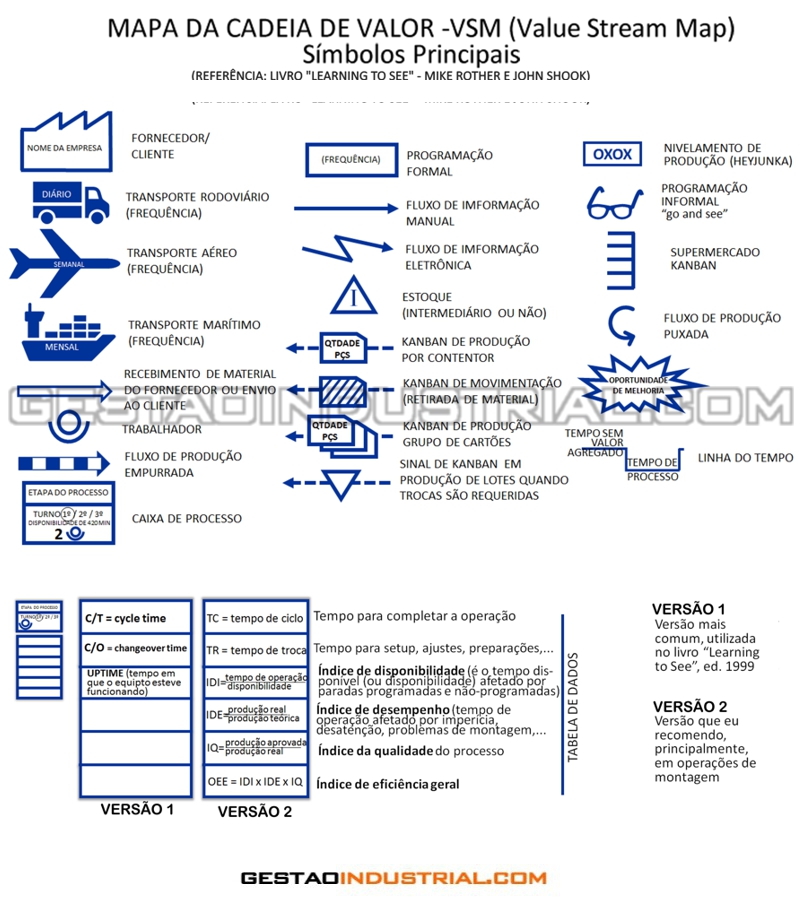 Os símbolos mais usados num mapa da cadeia de valor (ainda que haja variações) são os seguintes: